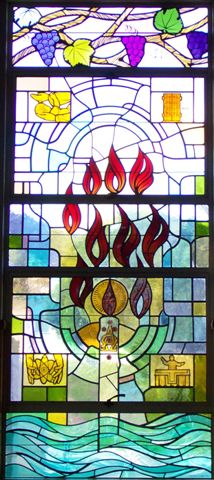 The third window begins a contemporary depiction of the sacramental life of the Church. We are united to Christ in the initiation sacraments of baptism and confirmation. We see the baptismal candle, the Paschal candle, rising out of the waters of baptism, and in the flames representing the Holy Spirit, the strength and dignity of confirmation.