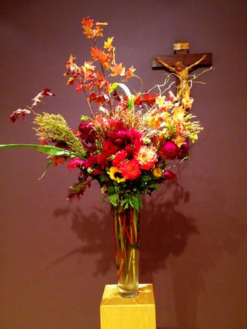 The photograph is the floral arrangement in the sanctuary from this past Sunday. Once again it comes from the generosity of Kim Foren. I admit she caught me rummaging through the trash container in her store for the twigs and fall leaves. I could not let these colors just die in the trash.