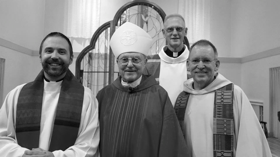 Retired Bishop Richard Hanifen of Colorado Springs celebrated Pentecost with us at Sacred Heart Church on Saturday June 7, 2014. Bishop Hanifen and our parish also celebrated the 30th Anniversary of the Congregation of Holy Cross serving in the Tri-Community. (Photo: Fr. Dew Gawrych, CSC, associate pastor, and Fr. Don Dilg, CSC, former administrator.)