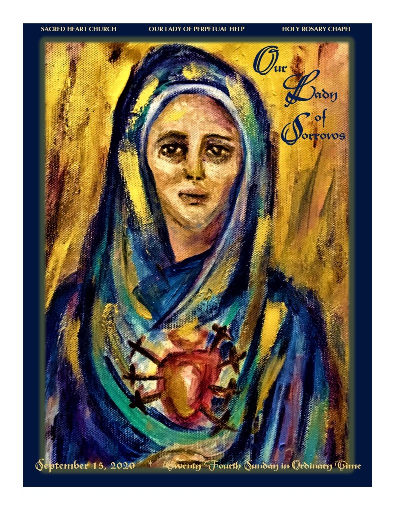 Mary, Our Lady of Sorrows, is the Patroness of the Congregation of Holy Cross. She gives us consolation and helps us witness to the suffering of people. At Sacred Heart Church, there are several images of pierced heart of Mary with seven swords. The Seven Sorrows in the gospel reveals the many times Mary witnessed the suffering of her son.