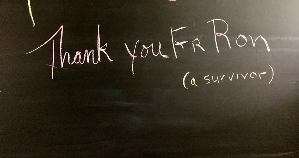 “Fr. Ron, I was abused as a child…” I heard this statement many times during the month of May. In the center of a crowded room surrounded by the paintings, I heard this from parishioners and strangers. The Stations, the art, the topic of abuse, all came together to provide a safe place for people to examine their own lives. Our families deserve such honesty. Many people commented to me that the exhibit was the first time they saw the combination of faith, provocative art, and the naming of abuse. I continue to pray for them and for all people who remain silent about the past. We all have much work to do, to name our experiences, and to help change the stigma of emotional and sexual abuse in our church and society.