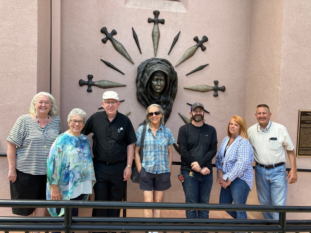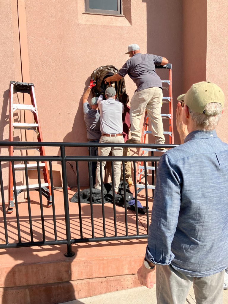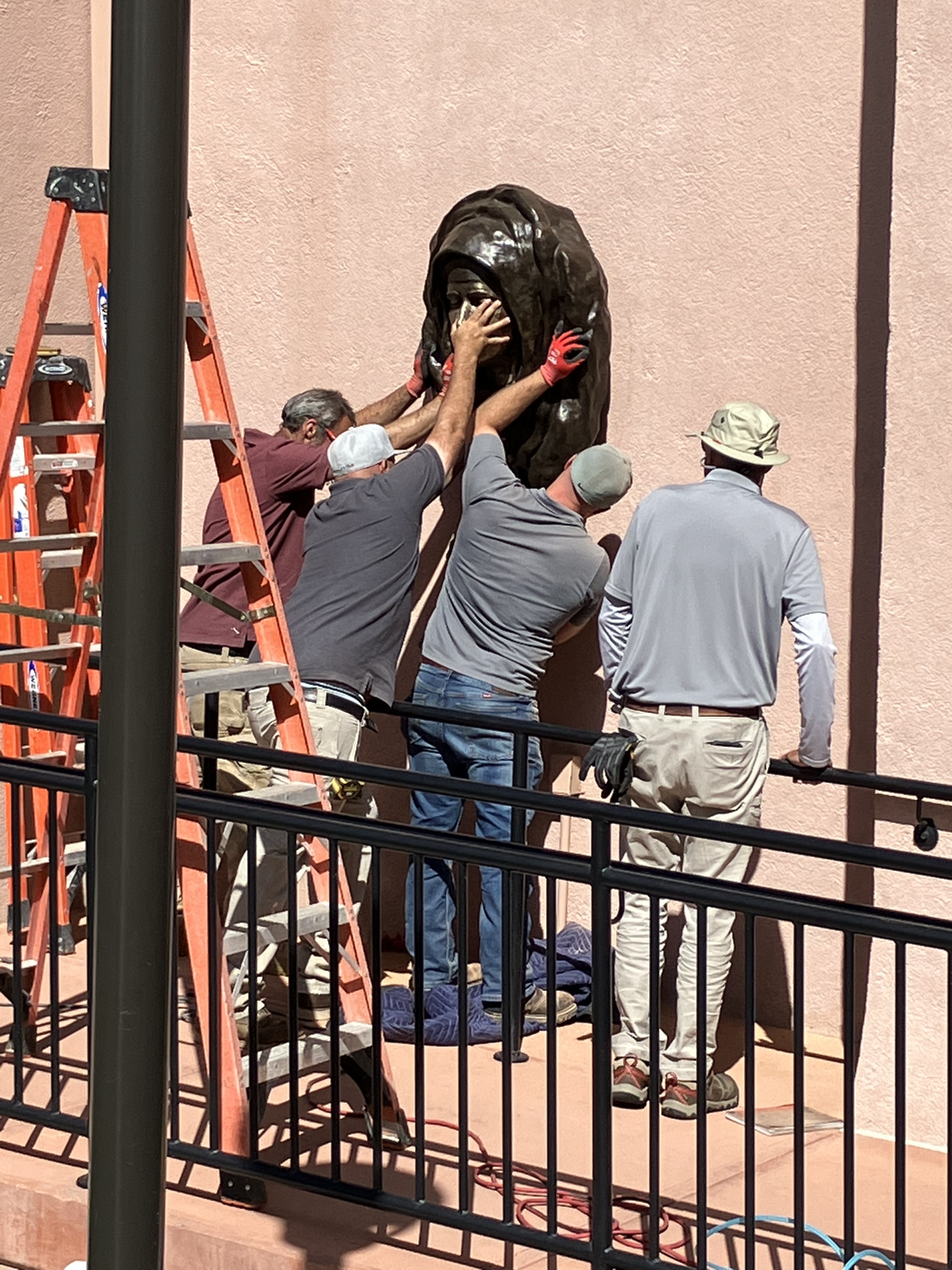 Today, June 14, 2022, the builders, artist, foundry owner, installed the bronze statue of Our Lady of Sorrows on Sacred Heart Church. The statue is stunningly beautiful, various shades of bronze on the granite color stucco. This is part of our 100th Anniversary celebration in July. Our parishioner, Joel Ernster, artist, sculpted the piece for our centennial. I am so delighted by the outcome. The project took one year to complete. Below is the text from the plaque: