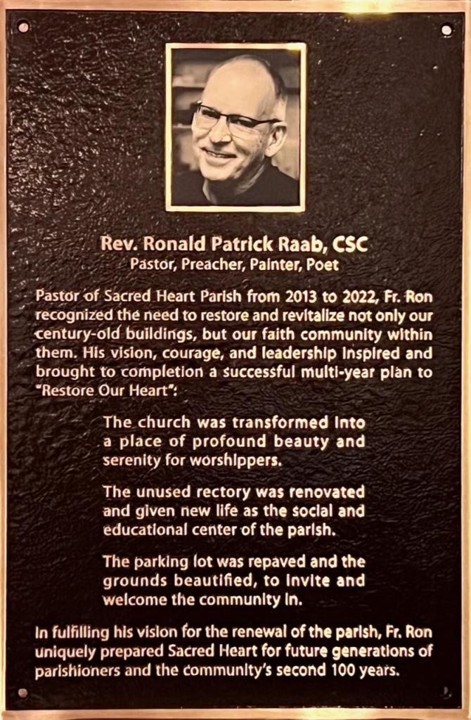 What a beautiful, and well-deserved plaque for all to see. What won’t be seen but surely felt are the Sacred Heart parishioners’ hearts saddened to see you leave yet grateful for having had your presence, while knowing how fortunate they are in Austin!