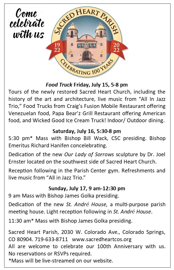Sacred Heart Parish: Celebrating 100 Years. Join us this week for our three-day celebration! Image Posted on July 12, 2022 by Ronald Patrick Raab, C.S.C. Share: Click to email a link to a friend (Opens in new window) Email Click to share on Facebook (Opens in new window) Facebook Click to share on X (Opens in new window) X Click to share on Pinterest (Opens in new window) Pinterest Click to print (Opens in new window) Print Like Loading... Related