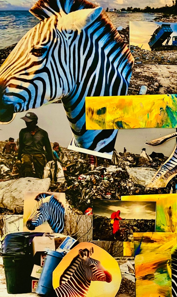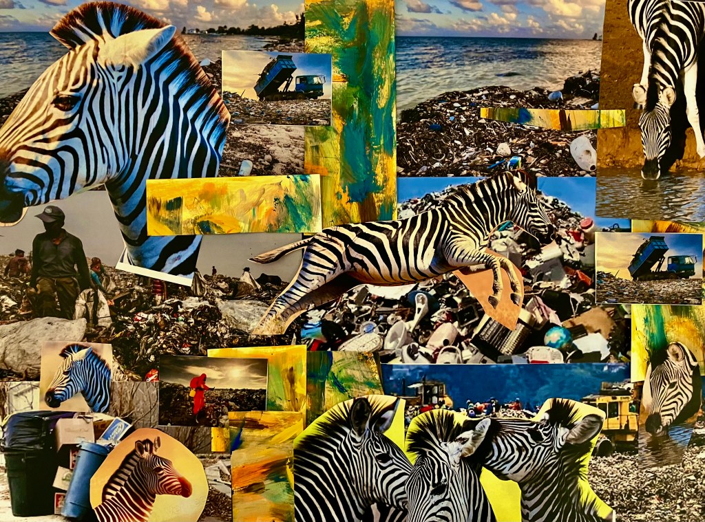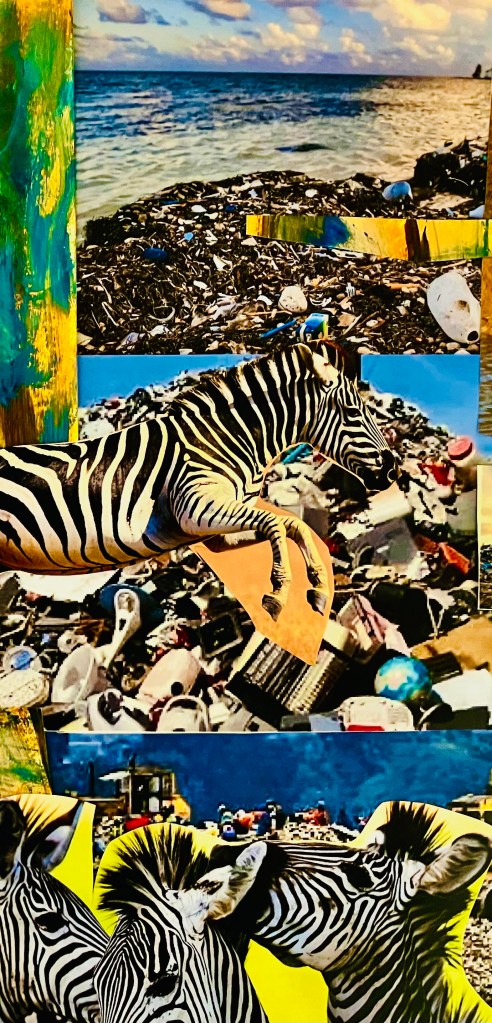In this collage, I use the juxtaposition of trash and the beauty of zebras to illustrate how we either share in our earth’s future or help to diminish our resources. Saint Francis of Assisi may help us understand our place upon the earth and to honestly care for everything that keeps us alive. This litany reflects on the gift of water as miracle to renew our generations.